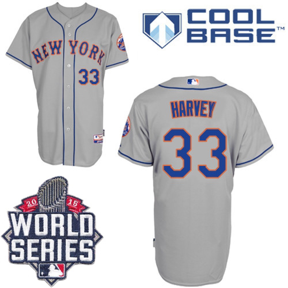 Mets #33 Matt Harvey Grey Road Cool Base W/2015 World Series Patch Stitched MLB Jersey