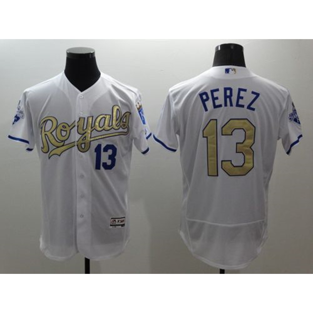 Royals #13 Salvador Perez White 2015 World Series Champions Gold Program FlexBase Authentic Stitched MLB Jersey
